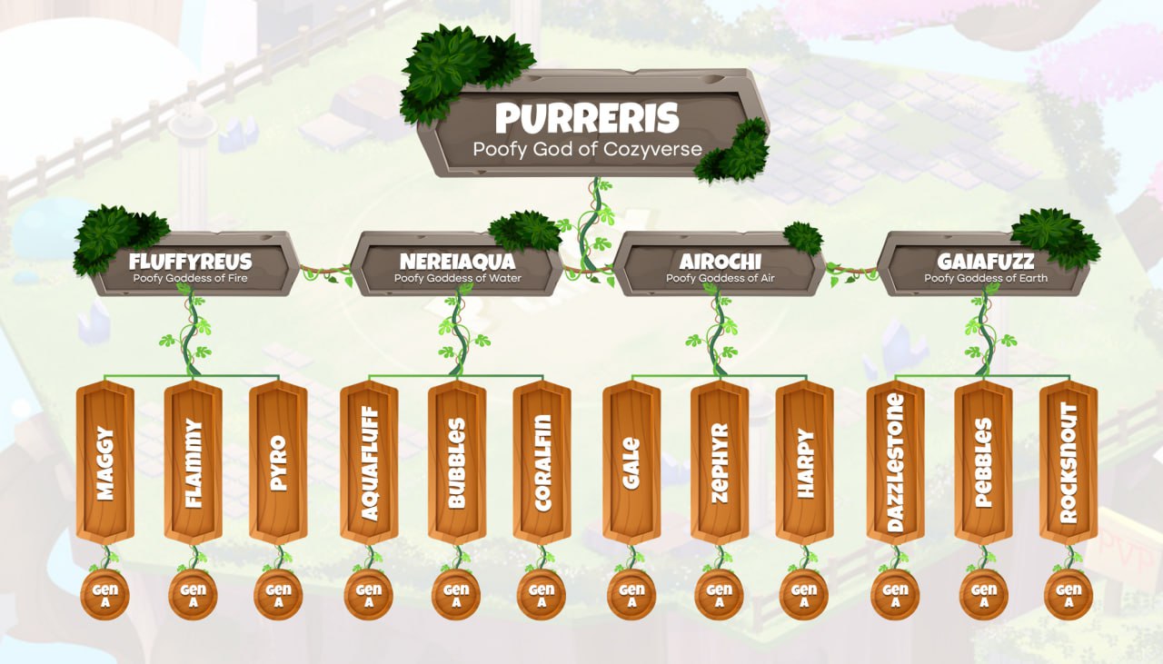 In the beginning, there was only darkness and silence until the Poofy God Purrerris created Poofyland, a magical universe filled with cuddly creatures called Poofies. Purrerris appointed four elemental gods to rule the different regions of Poofyland, each with their own unique powers and abilities. Airochi was appointed to Ventus - the air region, Nereiaqua to Aqua - the water region, Fluffyreus to Ignis - the fire region, and Gaiafuzz to Azura - the earth region.